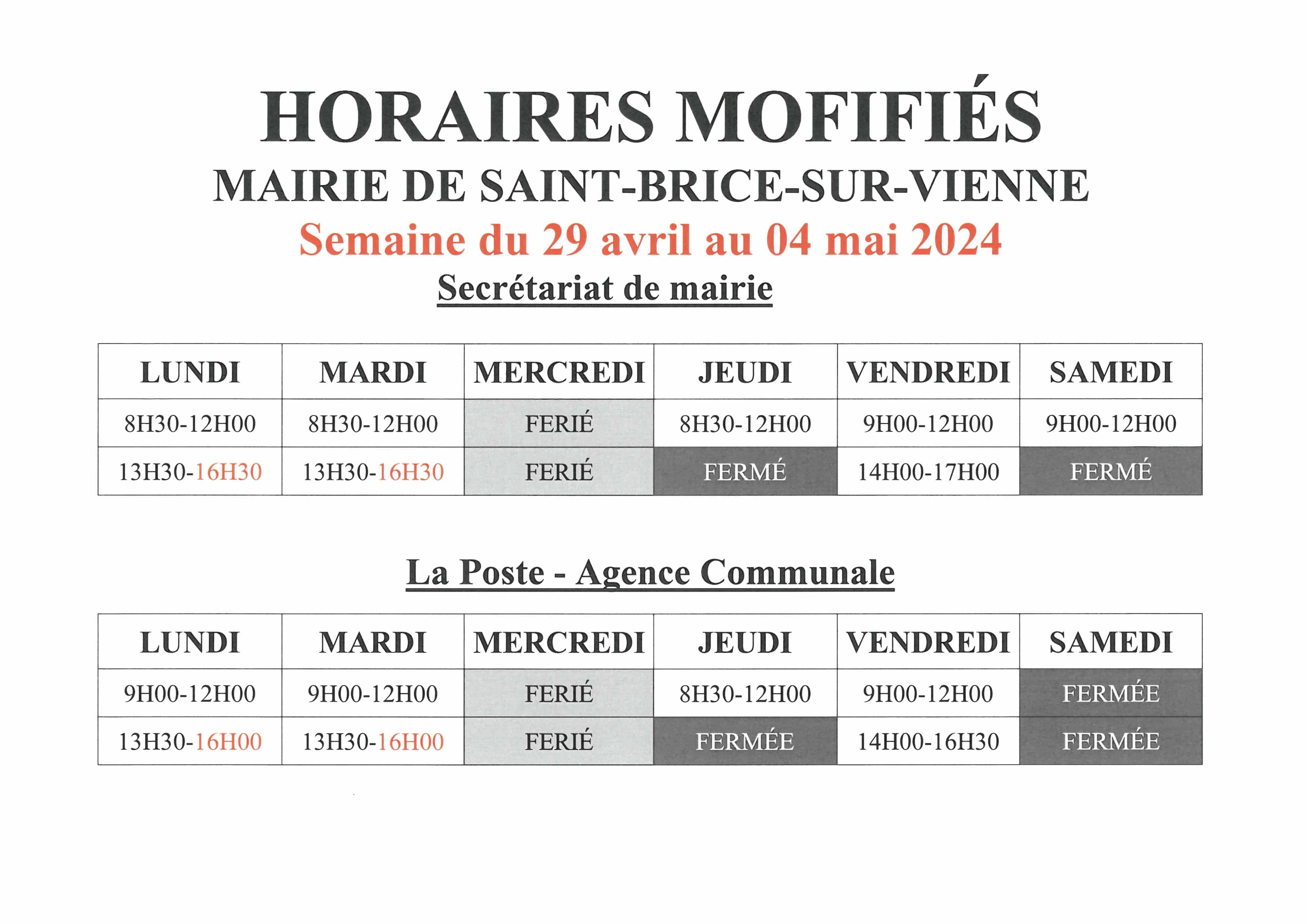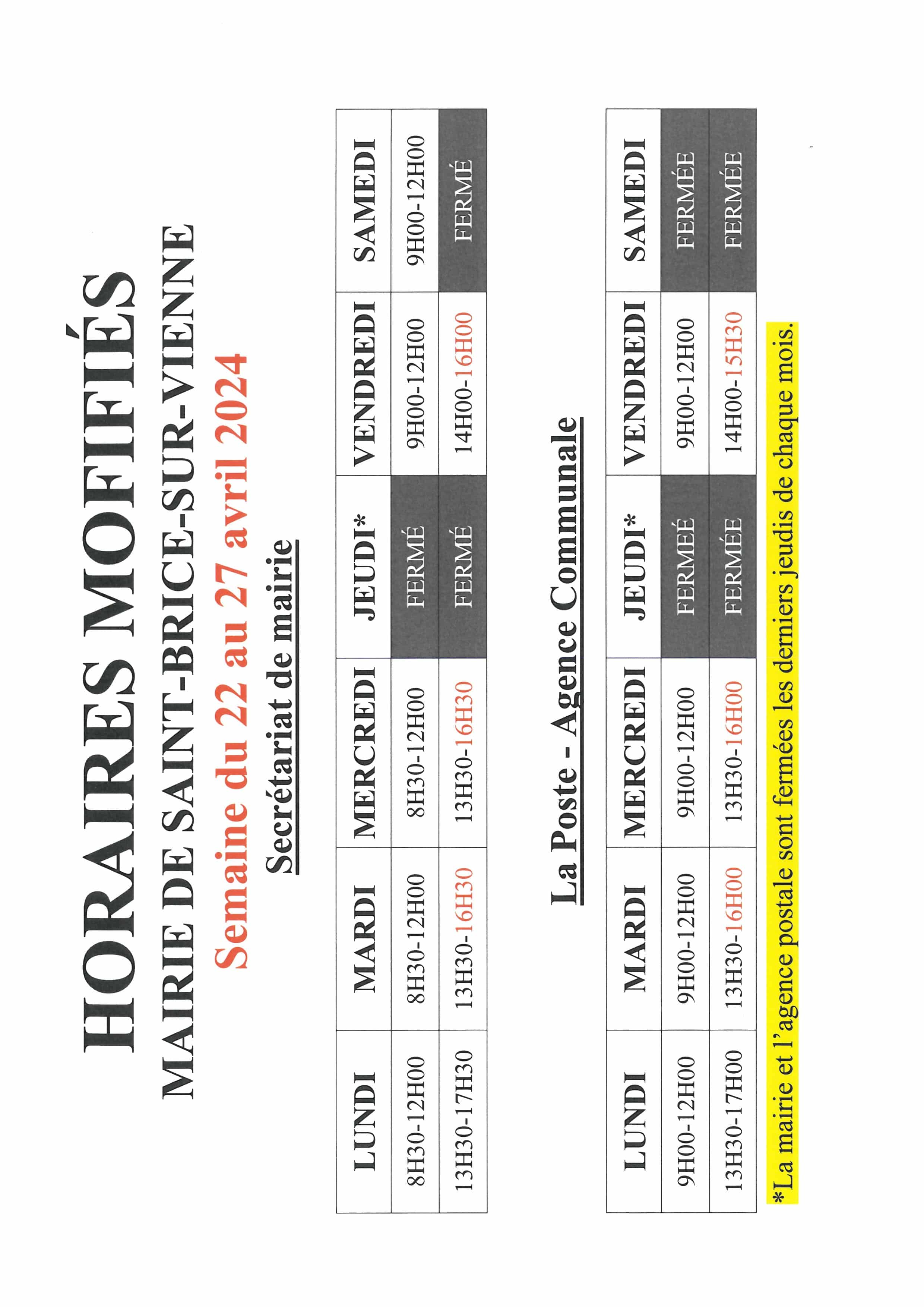 Pour les semaines 17 et 18, du 23 au 30 avril 2024 inclus, les horaires de la mairie et de l’Agence Postale sont modifiés comme indiqué dans les affiches jointes.