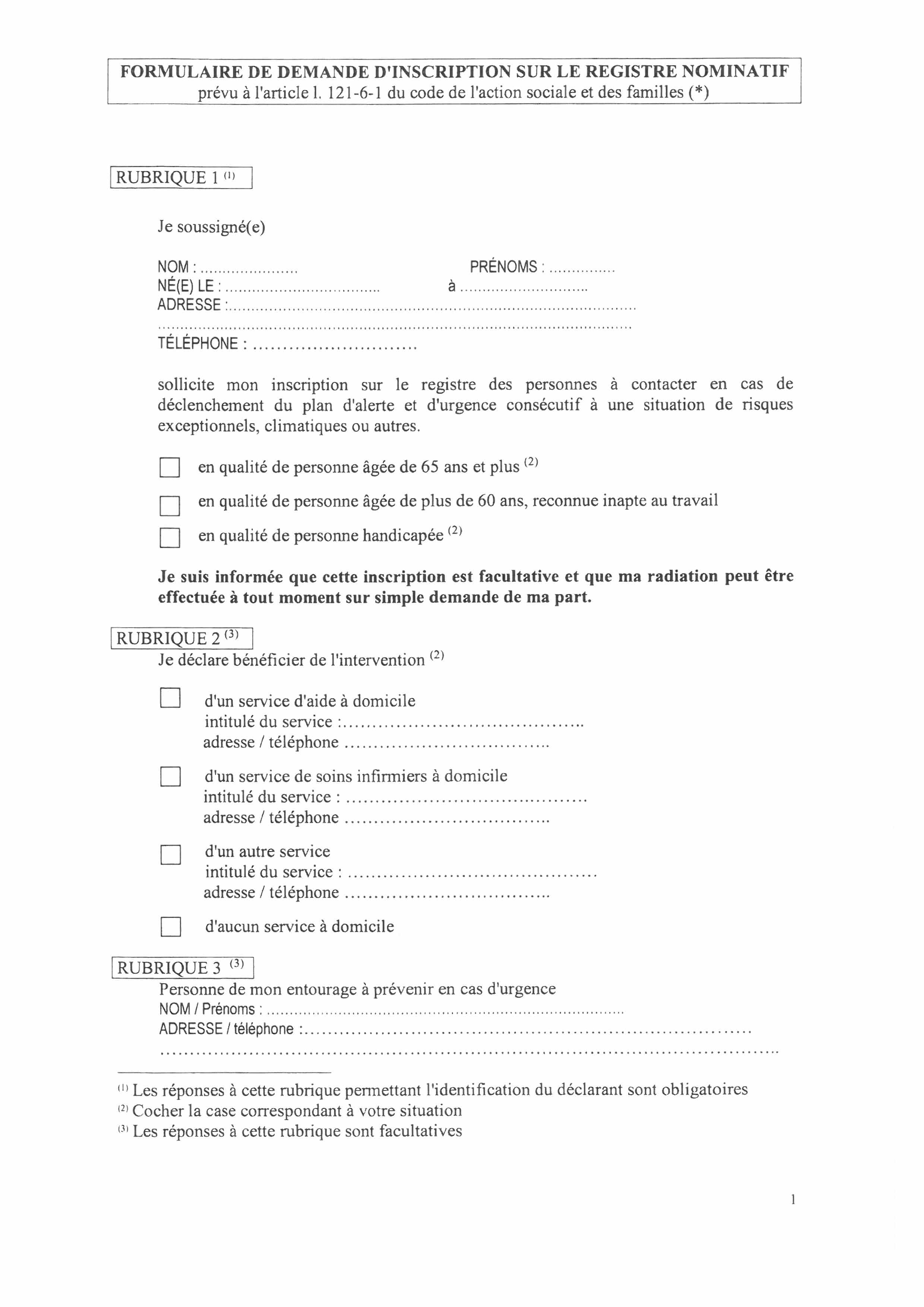 Depuis la canicule de l’été 2003, la loi impose aux maires d’instituer un registre nominatif des personnes âgées et des personnes handicapées résidant à leur domicile, afin qu’elles puissent être contactées en cas d’alerte. L’inscription sur ce registre est volontaire et facultative.