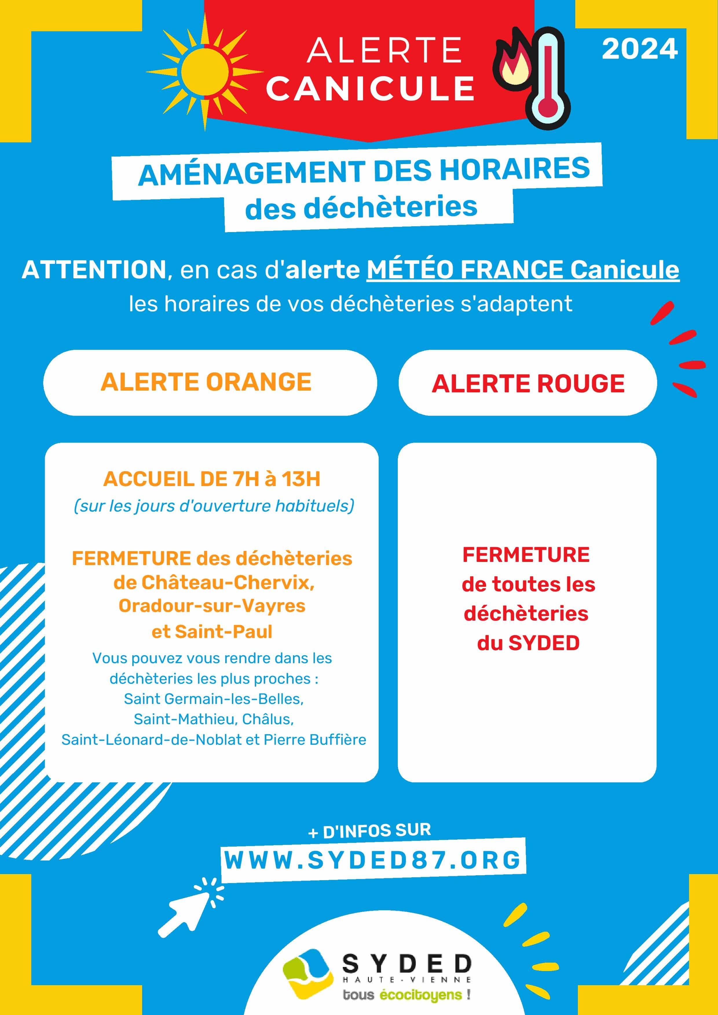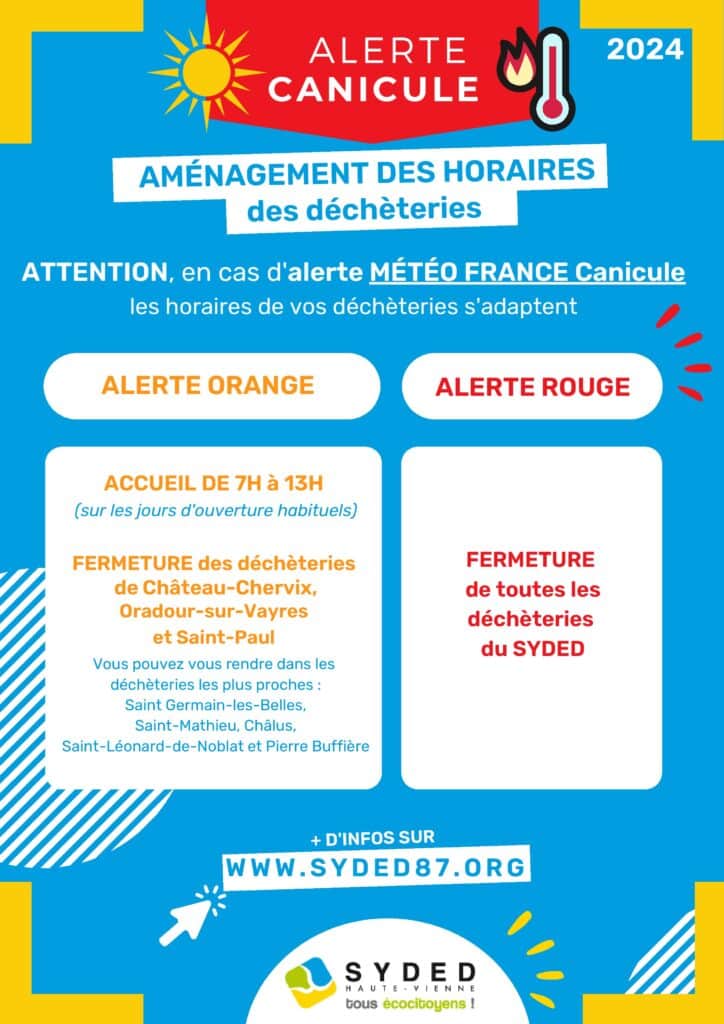 è Fermeture des déchèteries de Château-Chervix, Oradour-sur-Vayres et Saint-Paul. Les usagers peuvent se rendre dans les déchèteries les plus proches : Saint-Germain-les-Belles, Saint-Mathieu, Châlus, Saint-Léonard-de-Noblat et Pierre-Buffière.