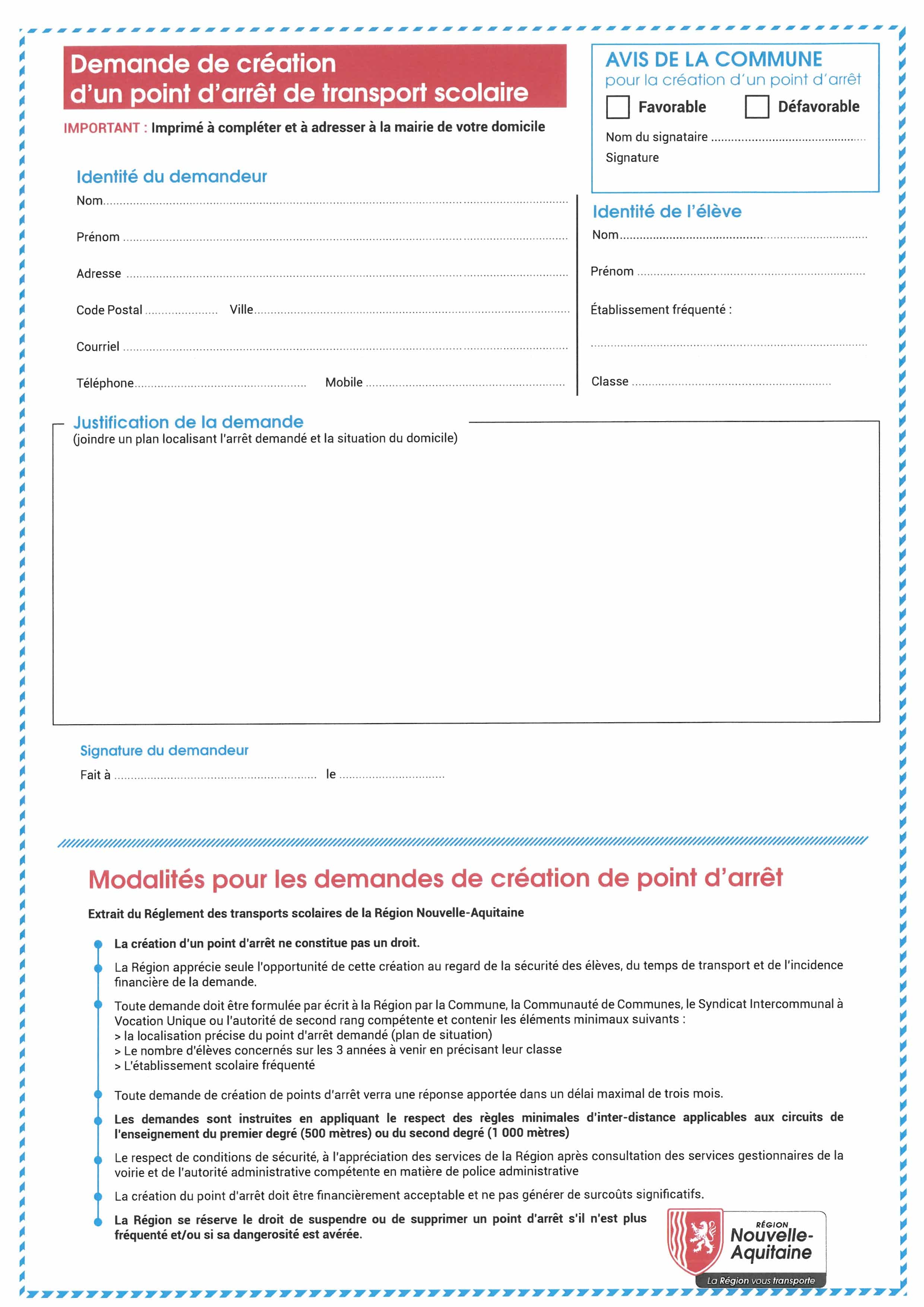 Les demandes de point d’arrêt doivent être réception par les services transport Région Nouvelle Aquitaine avant le 30 avril prochain, afin d’être étudiées en tenant compte du règlement des transports scolaires, pour une éventuelle mise en place à la rentrée de septembre.